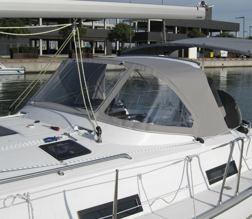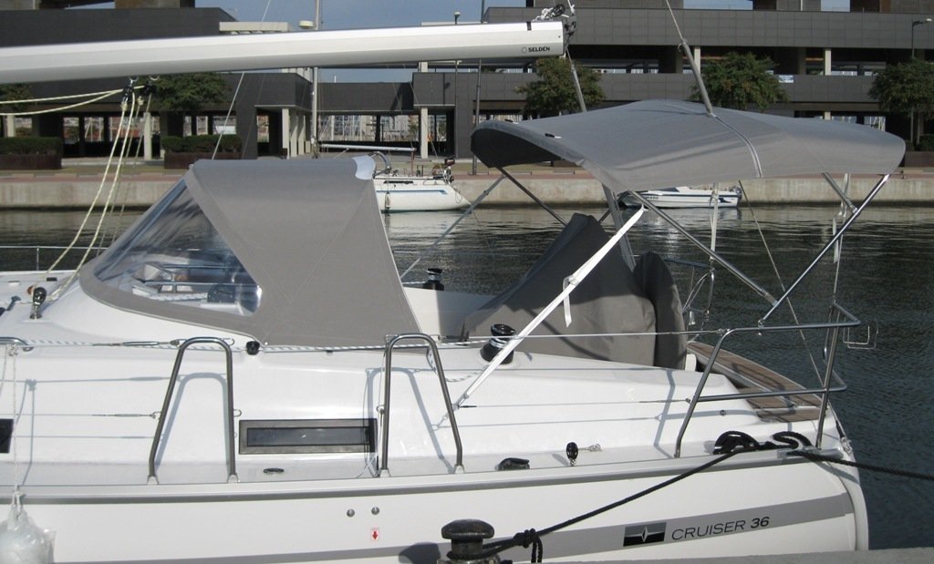 Sprayhood and frame kit designed for the Bavaria Cruiser 36, model year 2010 onward. Built with robust, marine-grade materials for long-lasting protection, including Sunbrella Plus fabric with enhanced water resistance and rustproof YKK zippers. All instructions for DIY installation are provided with the kit.