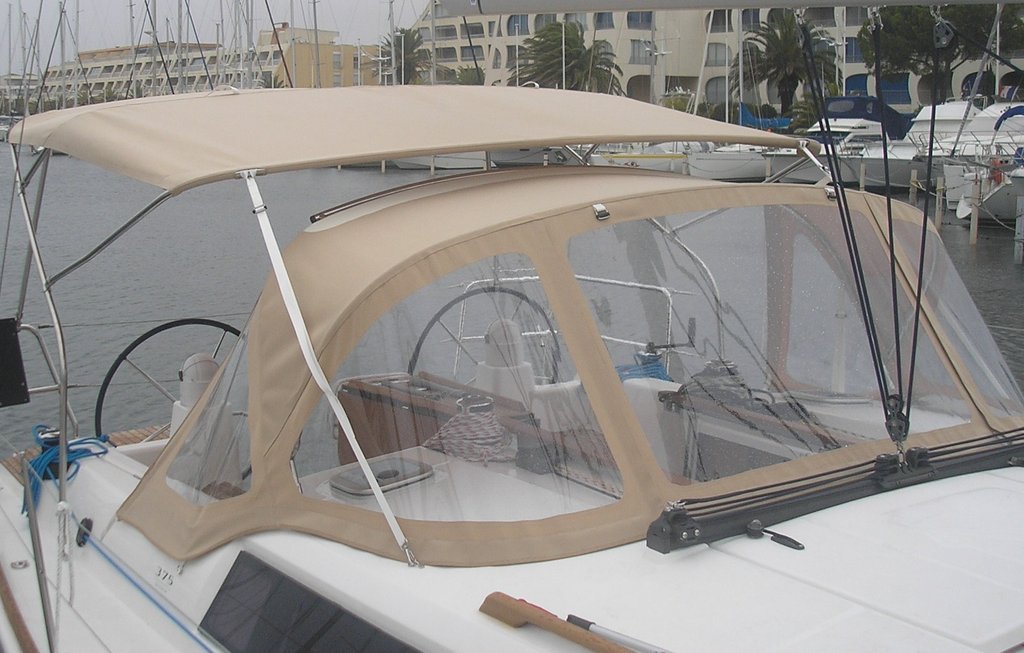 Sprayhood and frame kit designed for the Dufour 375 Grand Large, model year 2010 onwards. Built with robust, marine-grade materials for long-lasting protection, including Sunbrella Plus fabric with enhanced water resistance and rustproof YKK zippers. All instructions for DIY installation are provided with the kit.